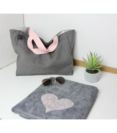 Kit à coudre un sac cabas lin couleur gris anthracite et anses roses. Le kit contient le lin, le simili cuir argent pour l'intérieur, le bouton pression et la sangle rose. tuto inclus.