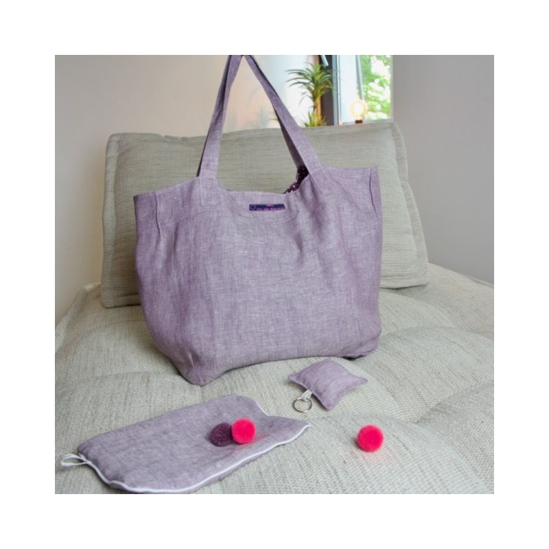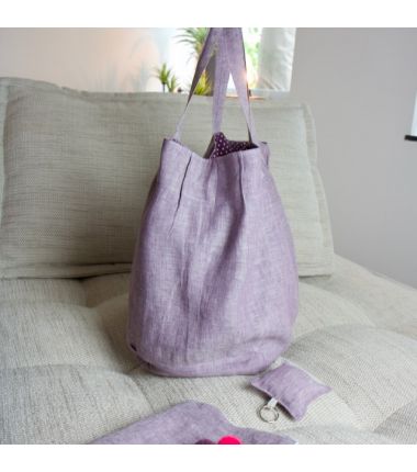 Sac en lin chiné couleur mauve parme,, intérieur coton. Fermeture aimantée. Dimension 50 x 60cm. Le sac est mou et donc pliable dans vos bagages pour les vacances. Le lin donne un aspect chic et simple. Juste dingue!!