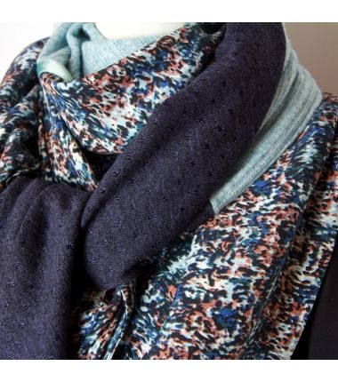 Kit à coudre un foulard triangle à 3 bandes. dimension: environ 90 x 200 cm. Le kit contient les tricots marine et menthe et la viscose imprimée et les rubans. Pas de passepoil. Tuto inclus.