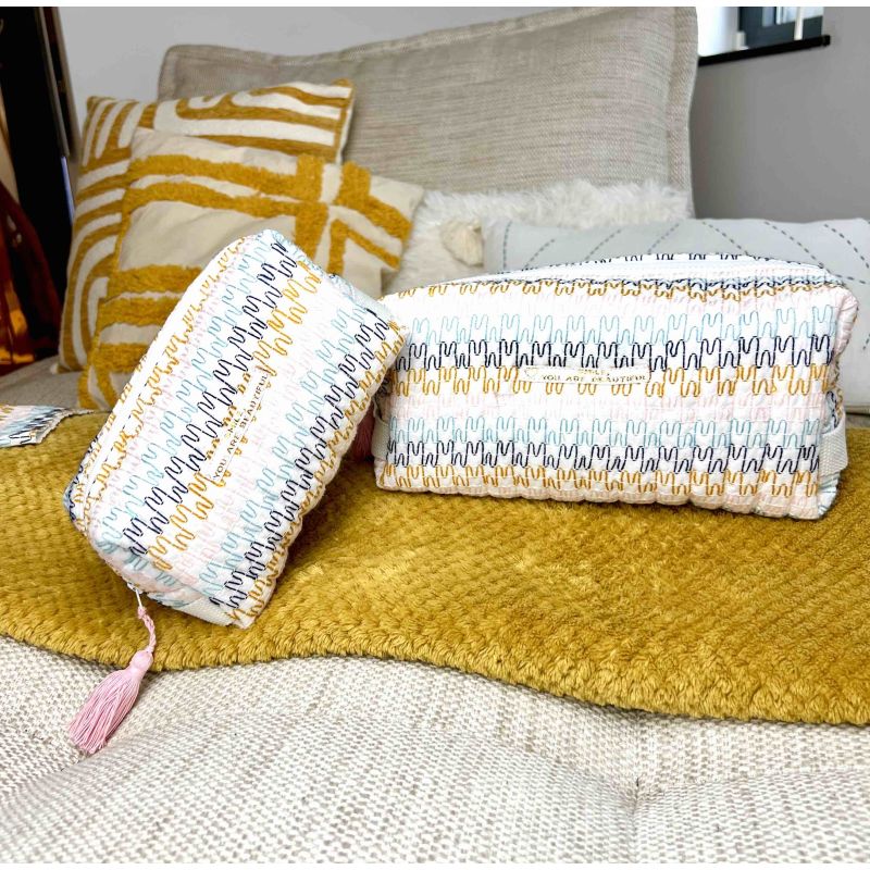Kit à coudre une trousse carrée doublée et dont le tissu extérieur est en matelassé à faire soi-même. Dimension: 25x12x12 cm. Le kit contient les tissus: le coton blanc et multicolore, l'ouate de doublure du matelassé, l'enduit intérieur, la fermeture, le ruban et le tuto.