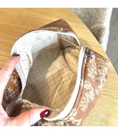 Kit à coudre une trousse carrée doublée et dont le tissu extérieur est en suédine. Dimension: 25x12x12 cm. Le kit contient les tissus: la suédine, l'ouate de doublure du matelassé, le coton intérieur, la fermeture, le ruban et le tuto.
