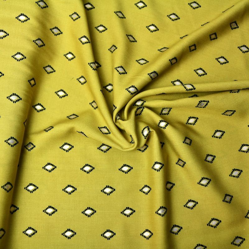 Viscose à imprimé losange et petites touches or. Le moutarde tend vers le jaune olive. souple et léger.