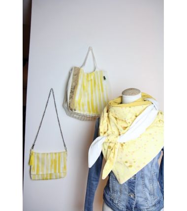 Kit à coudre un Grand sac cabas. Dimension: environ 60 x 40 cm. Le kit contient 2 tissus extérieurs, toile jaune imprimé Rico Design, toile blanc crème, le ruban paillettes or, la sangle blanche et le tissu intérieur enduit Rico Design. auto inclus.